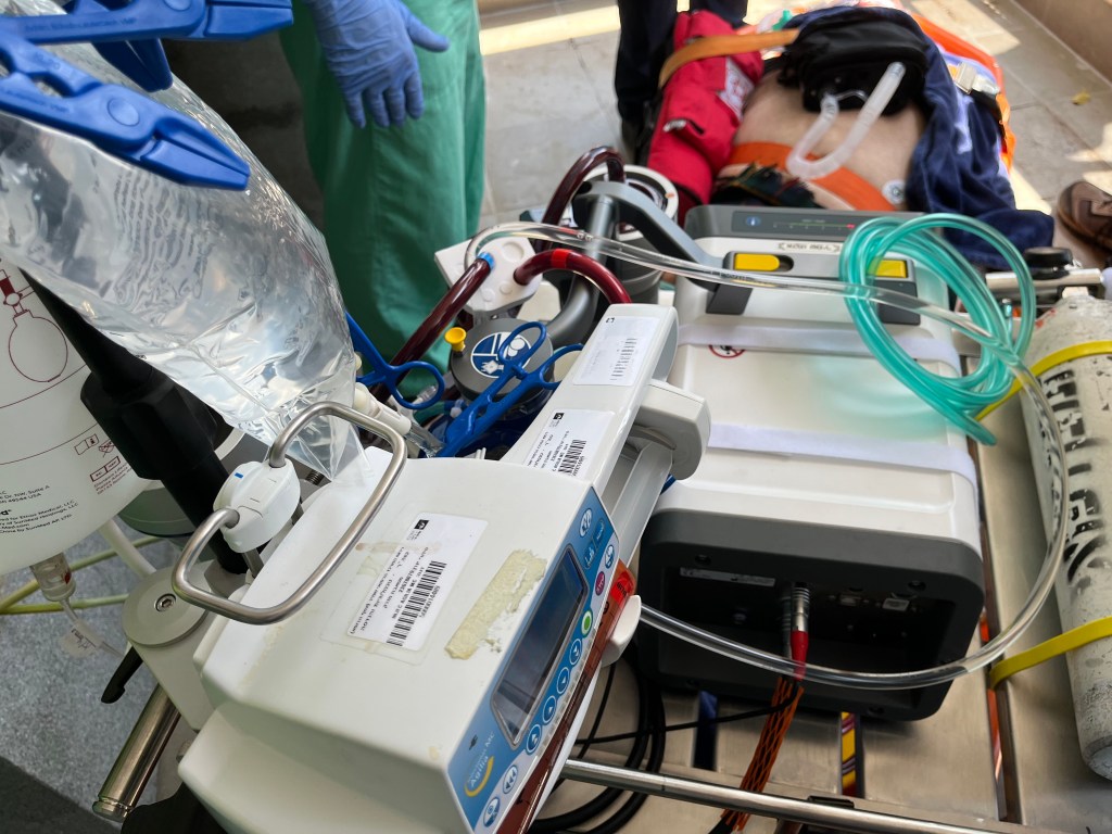 ECMO was called and arrived in another ambulance with 3 physicians. We were still doing CPR. They produced a machine that went around the patient and was able to do extremely effective chest compressions. A doctor then prepared a sterile field in the groin area. He then placed needles in the right femoral vein and artery. This was followed with wires that went up the vein and artery. A 1 cm tube was then inserted into each vessel. These tubes were connected to a portable heart-lung machine to take out the venous blood, re-oxygenate the blood and replace it in the artery. I didn’t even know that such a machine existed.