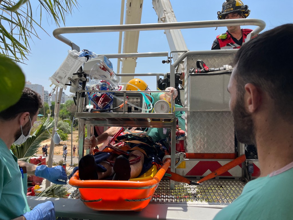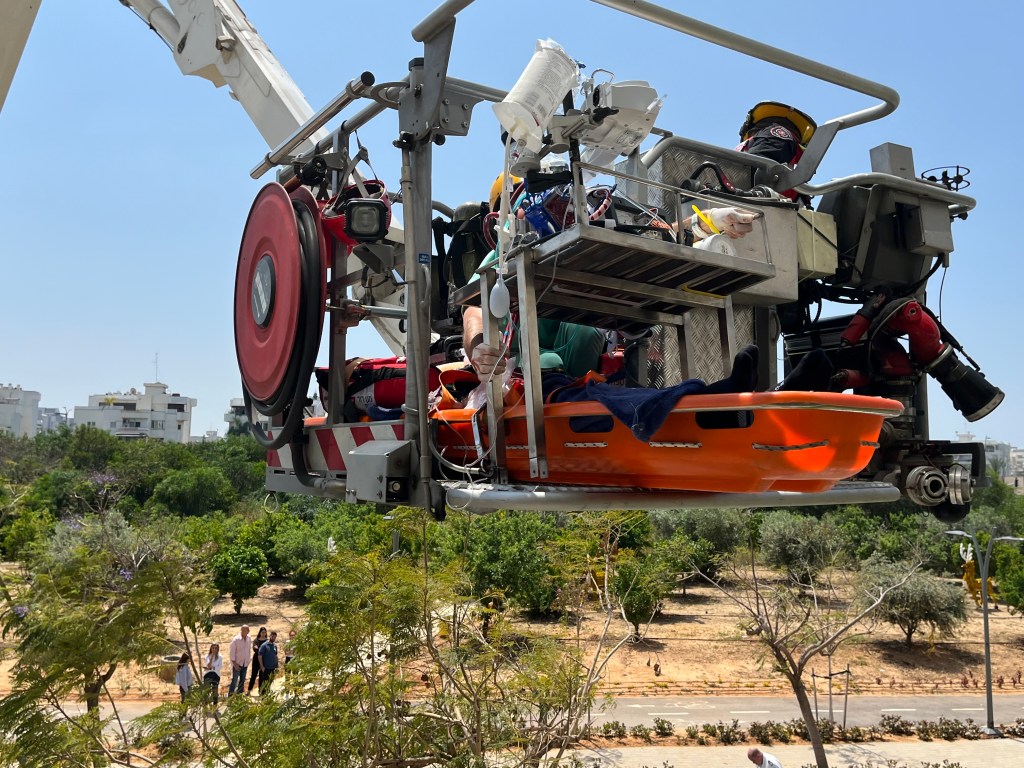 The patient miraculously regained consciousness. The fire department was called as we could not get the patient and all the equipment into an elevator. A hook and latter truck raised a platform to the 2nd floor. The patient was placed on a hard portable stretcher and moved onto the elevated platform. The platform was then lowered to the awaiting ambulance and transported to a hospital. We later learned that he had undergone an angiogram and will probably require a bypass. The LAD, the main cardiac artery was 99% blocked. ‘Been there, done that’ and played hockey 3 months later. I think that Israel is much more advanced than us for doing advanced CPR in the field. There training must by much more involved than ours.