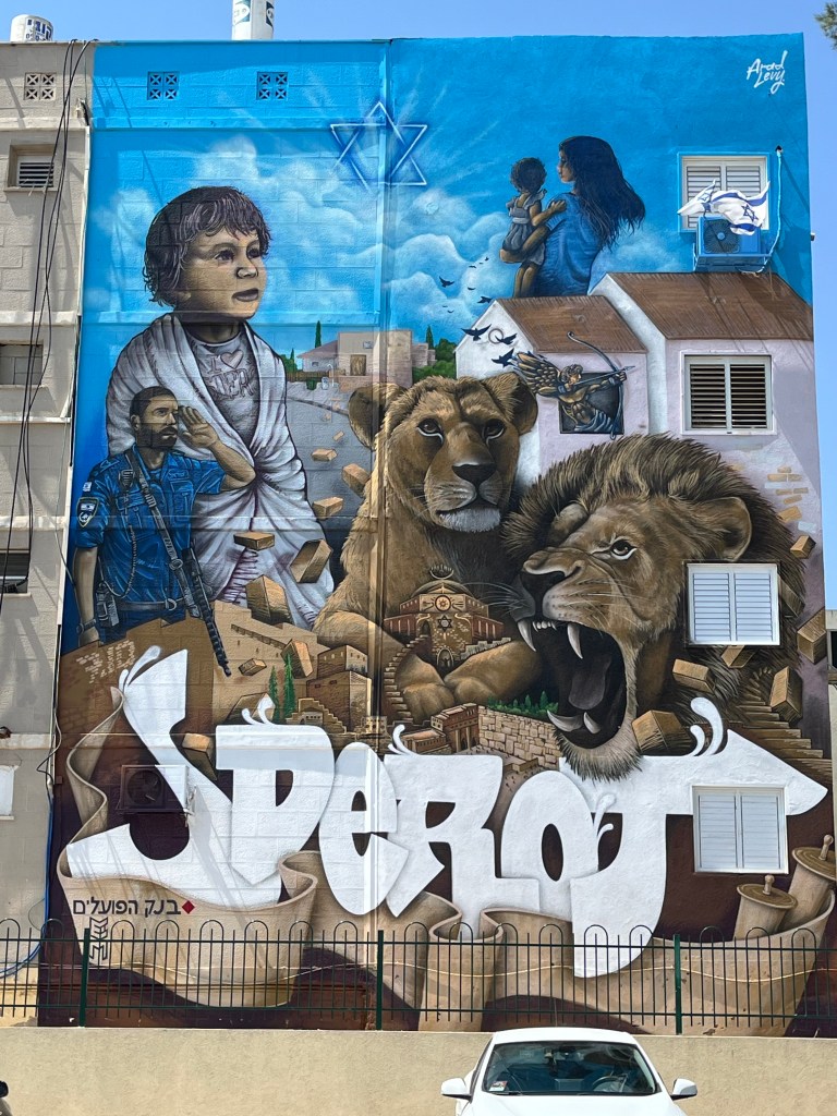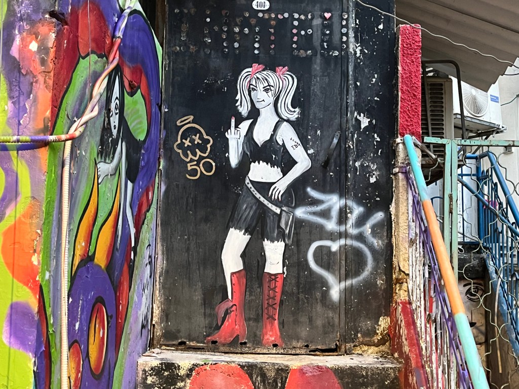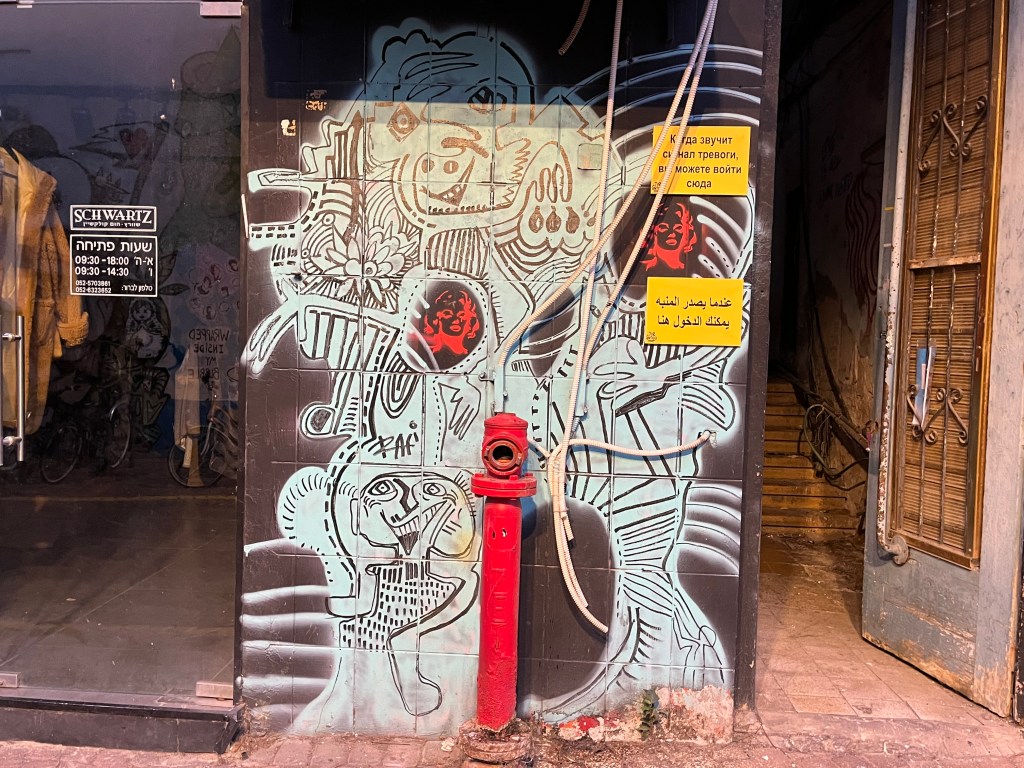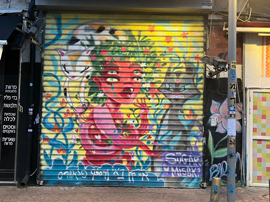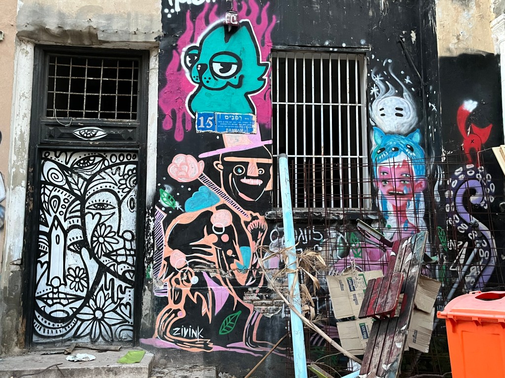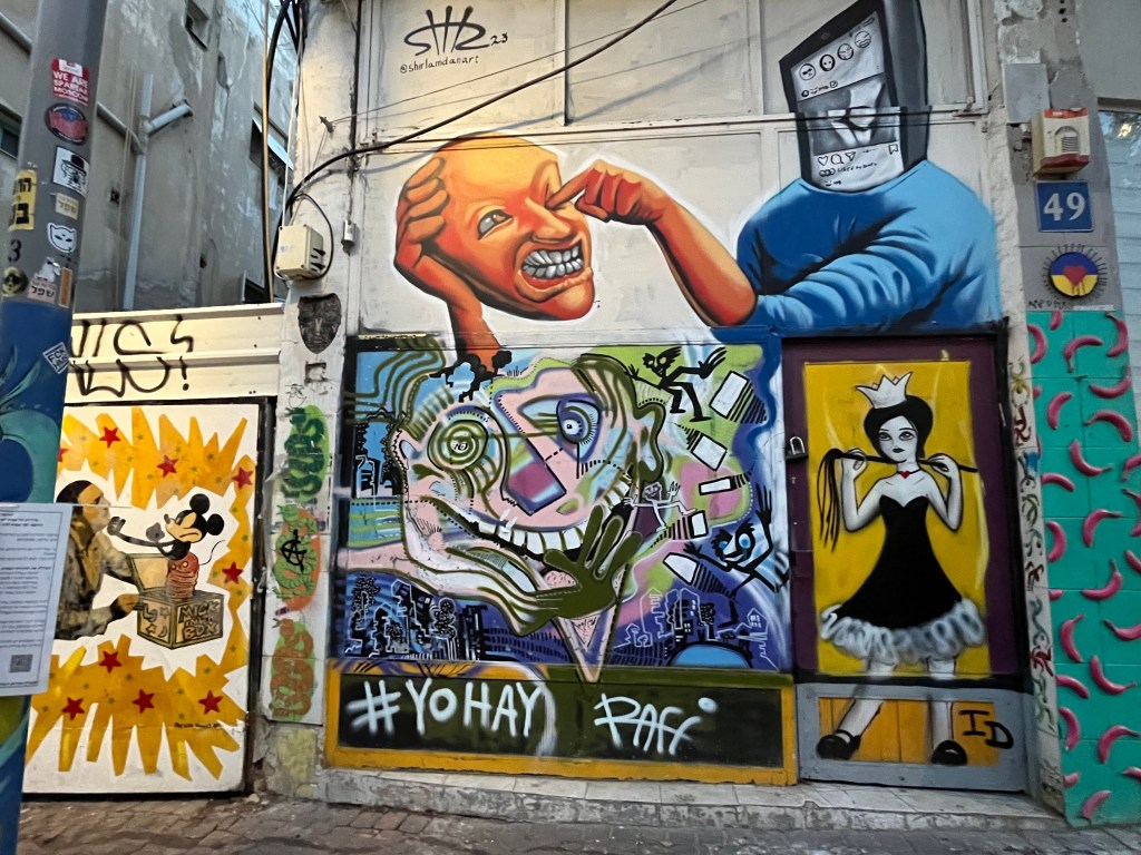 The restaurant was in the Neve Tsedek area of Tel Aviv. We walked there and sort of got lost on the convoluted streets, passing through the Florentin area. Neve Tsedek is an older area that has been completely renovated. It has upscale restaurants and shops and is more expensive to live in. Florentin is probably what Neve Tsedek used to look like before it got gentrified. The streets are very narrow and the area has 1 cafe and restaurant after another. It caters to the student, young adult and artistic crowd. Usually I don’t like graffiti but this type was really good quality art work. The food at the restaurant was wonderful.