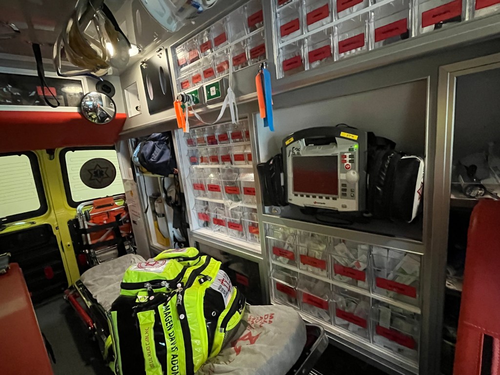 In Israel the 1st responder is often a p-m on a motor cycle. A BLS, basic life support ambulance is called for basic resussitation. They can do EKGs, give oxygen, take bloods, BPs, do CPR including shocking the patient if required. An ACLS ambulance can do more in depth diagnosis and treatment including giving major medications. There is also 1 ECMO ambulance, made in France, with an ECMO machine that I will describe later.