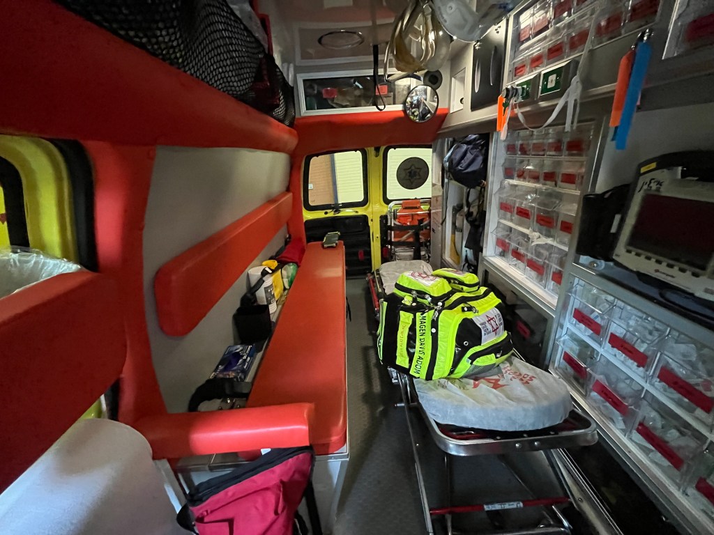 I am getting used to the types of call that we receive. Elderly people with chest pain, shortness of breath, stroke, not feeling well with no obvious signs, car accidents. We take a history, do a routine physical, do an EKG, test for glucose, put on a monitor and oximeter and BP cuff, start an IV and then transport to the hospital at the speed necessary depending upon the urgency.