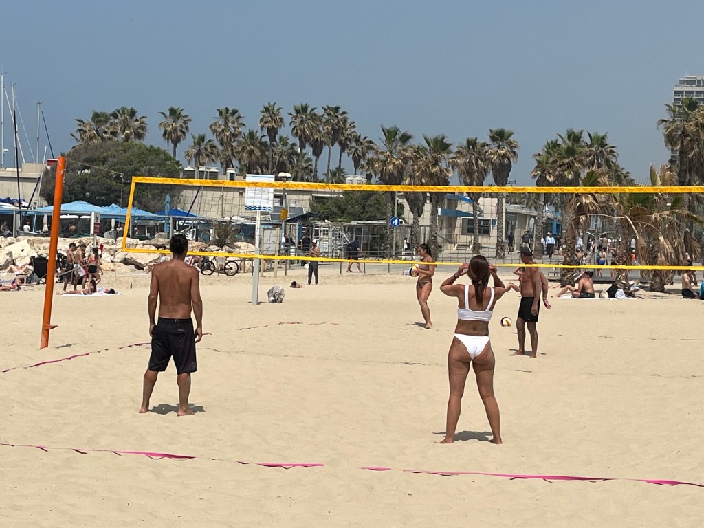 I then walked along the beach for an hour. The beach was full but not backed like in the summer on the Riviera. The guys wear short type bathing suits; there are no speedos. The girls all wear bikinis varying from the French style to the Brazilian style bathing suits. There are very few blonds here; most of the Israelis on the beach appeared to be Sephardic in origin. Even with my tan, I am very light skinned here. Everyone was playing volley ball or soccer in a group without allowing the ball to touch the sand. Impossible…