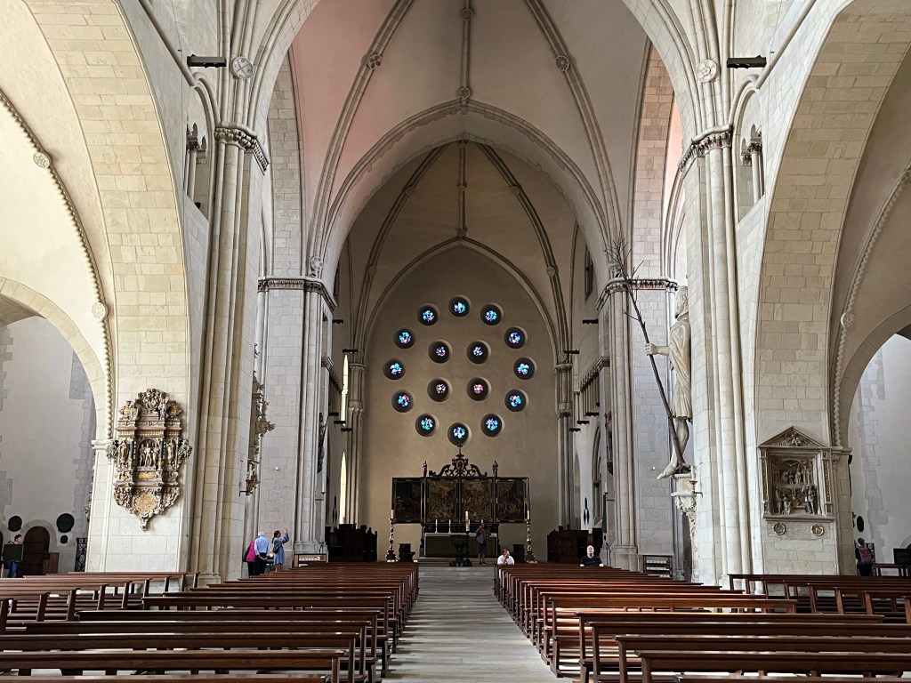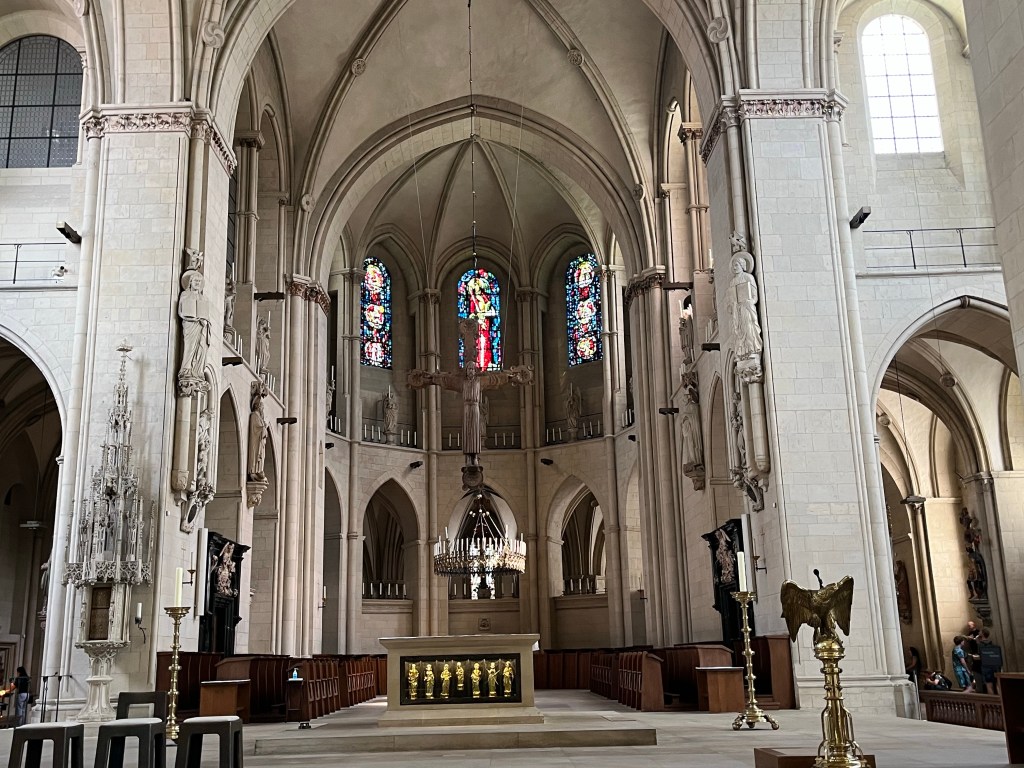 Eventually, I parked my bike near a church so that I could remember where I parked it. The streets all go around in circles; no street is straight for more than a few blocks. The streets also change names abruptly to confuse the tourist. Forget about finding numbers on buildings; that is a myth in itself. I visited St Paul’s Cathedral. There are several St Paul’s Cathedrals in Europe. This one was built originally in the 9th century and then rebuilt in the 13th century. It was damaged during the war but restored magnificently. The building is huge and the acoustics are incredible. I coughed and I think that it echoed through the church.