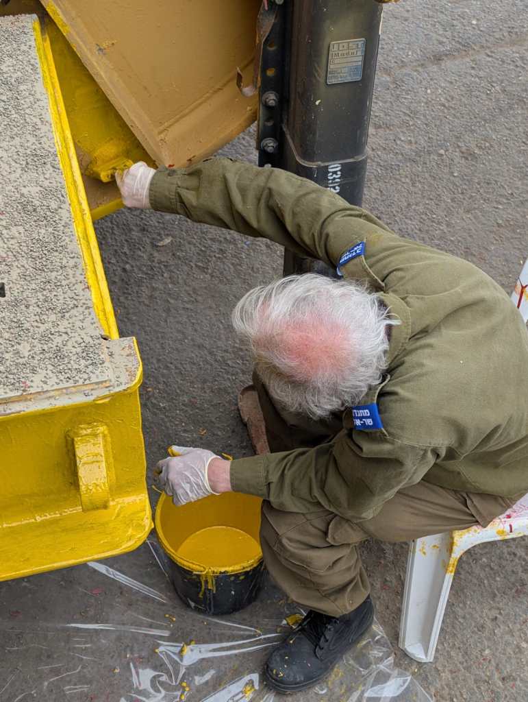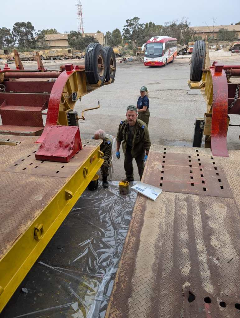 We were up early this morning and had a change of pace. After breakfast and flag raising, our mahidrot asked for volunteers to paint. My hand and 2 other fellows hands shot up and all of a sudden I was a professional painter. We were driven off to a new place on base with several flat bed trailers which were in serious need of a paint job. We split into 2 groups, the red paint group and the yellow paint group. One fellow was in charge of scraping and dusting first. The red paint was very thick and specially made to go over rust and partially peeling paint. We worked for 2 hours, had a short coffee break and continued on to lunch. I tried to be careful about getting paint on myself. 1 of the fellows was less careful and spent some time at the wash basin with turpentine.