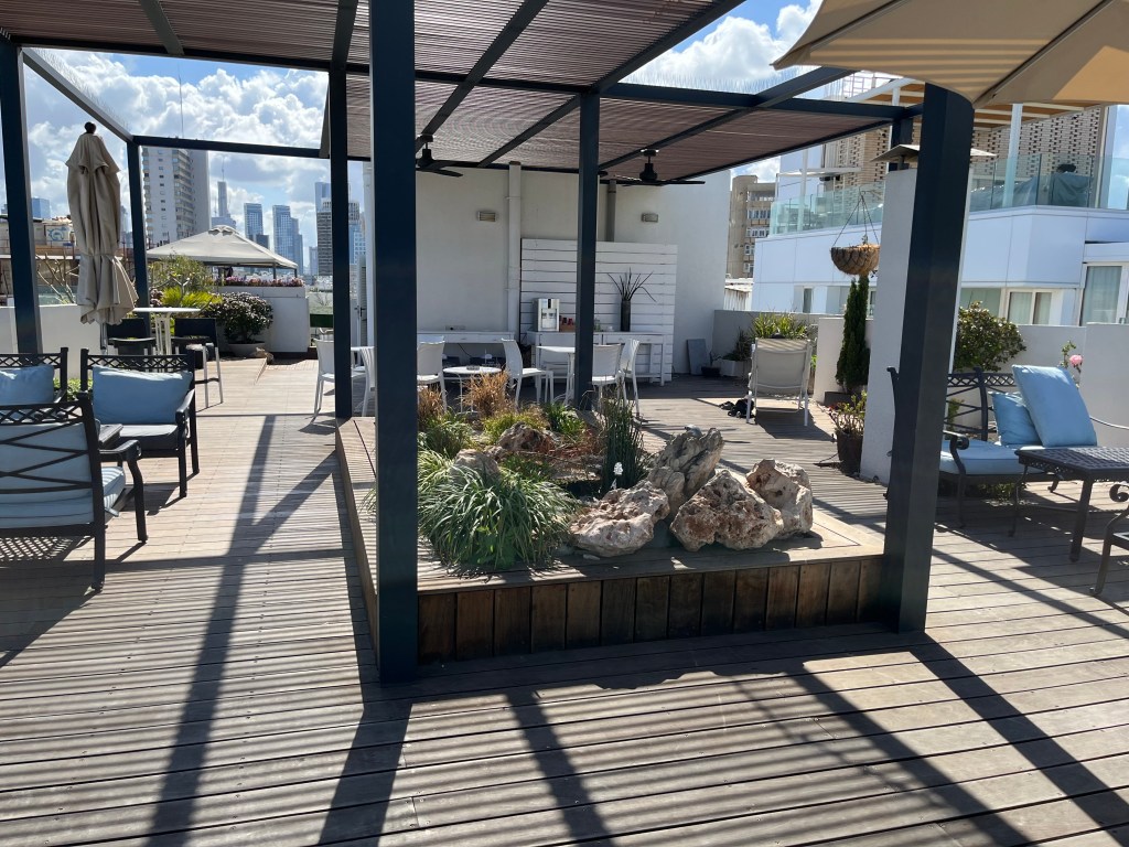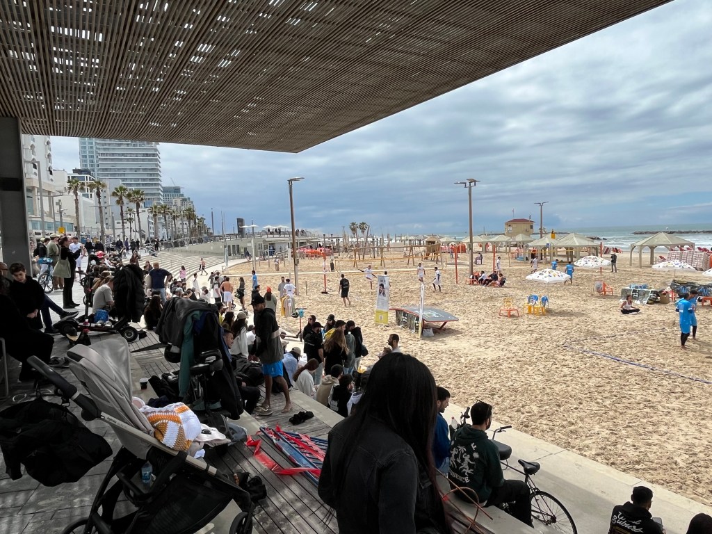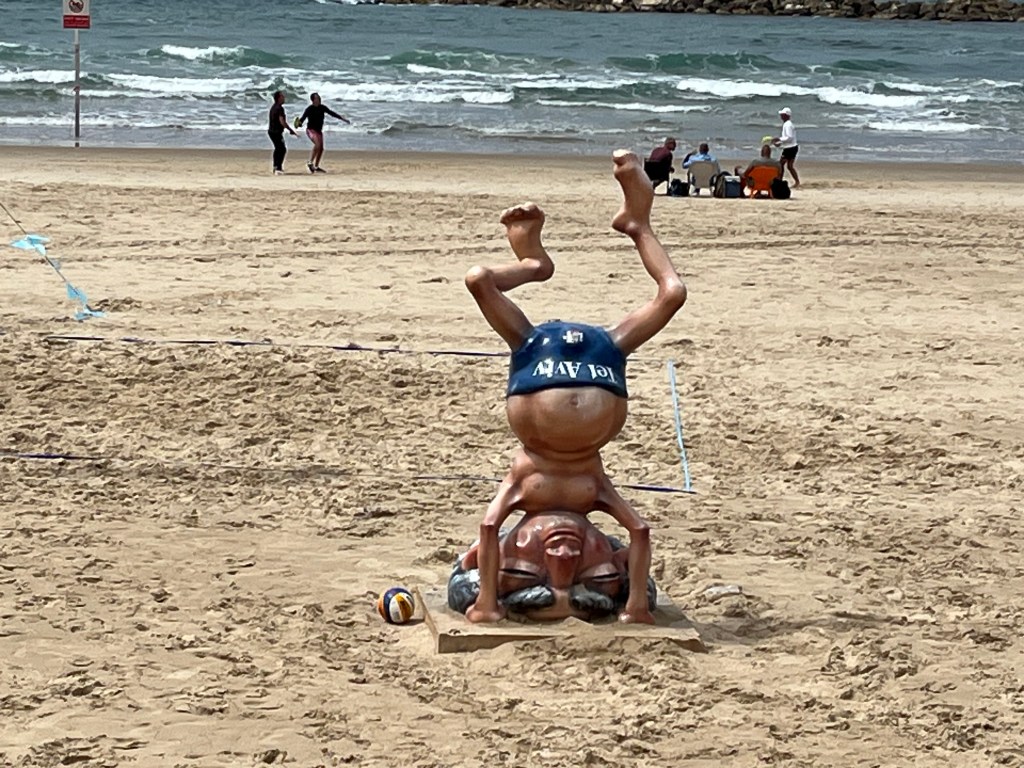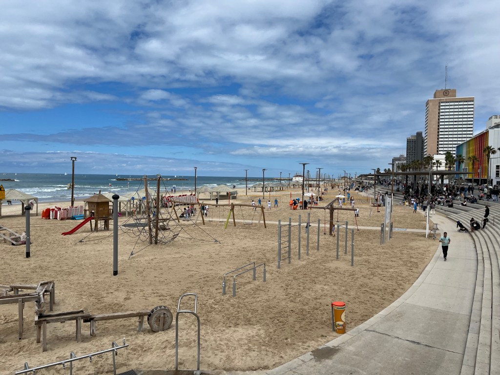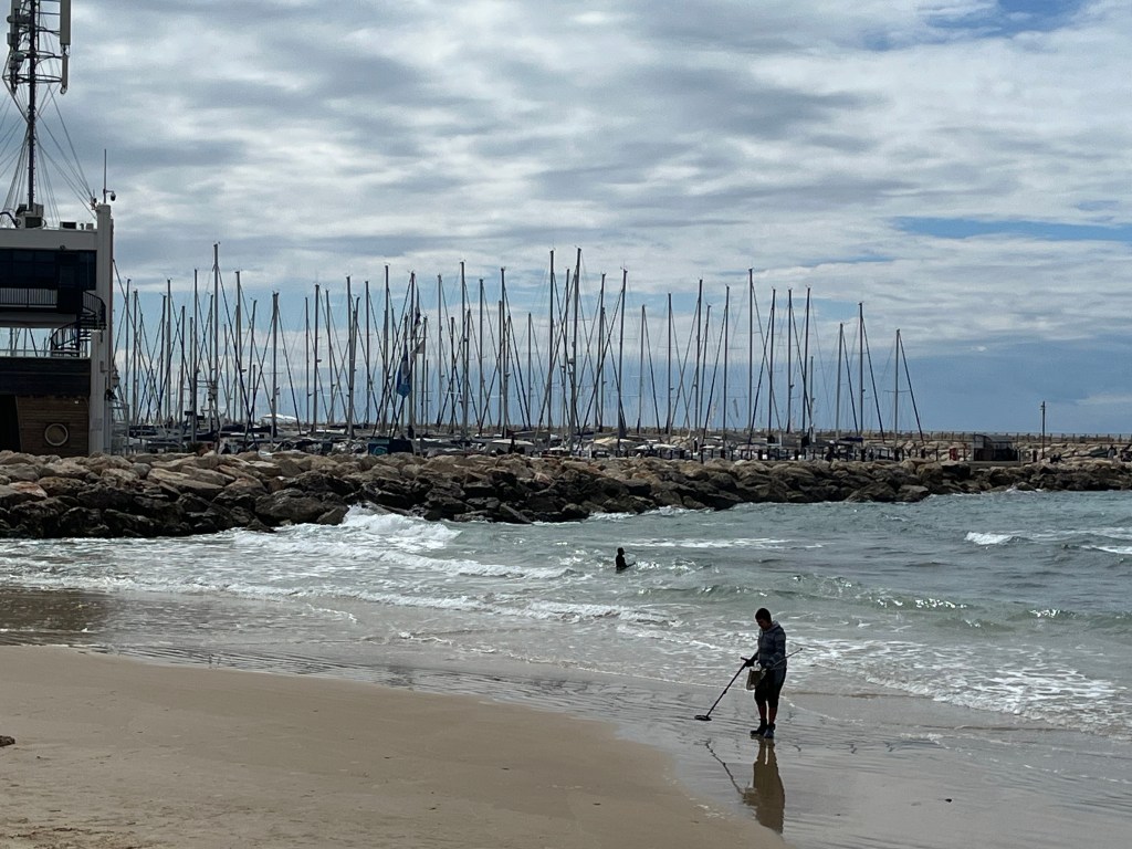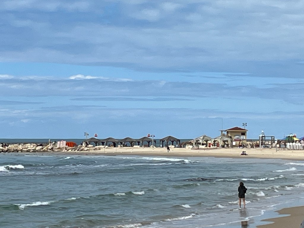 In the afternoon after packing, I went out onto the beach for my last sun tanning and swimming. I lie in the sun for 30 min and then go for a 15 min swim. I also picked up a few rocks on the beach for my kid’s and friend’s rock collection. I walked along the beach until I found the noisiest bar and restaurant. The music is deafening, a real party atmosphere which is just what I need for my last evening in Tel Aviv. I am treating myself to a white fish brochette and a beer while sitting on a high chair at a table over looking the beach. Why not, I guess that I have to celebrate a successful adventure in Israel.